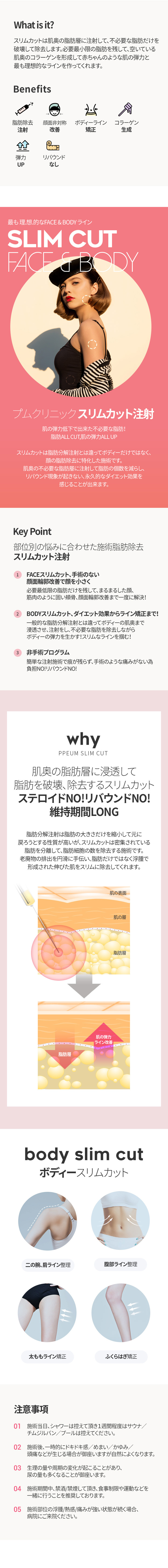 プムだけの特別なレシピ スリムカット注射は不必要な脂肪を除去して コラーゲンを形成してより弾力のあるスリムなラインをデザインします。